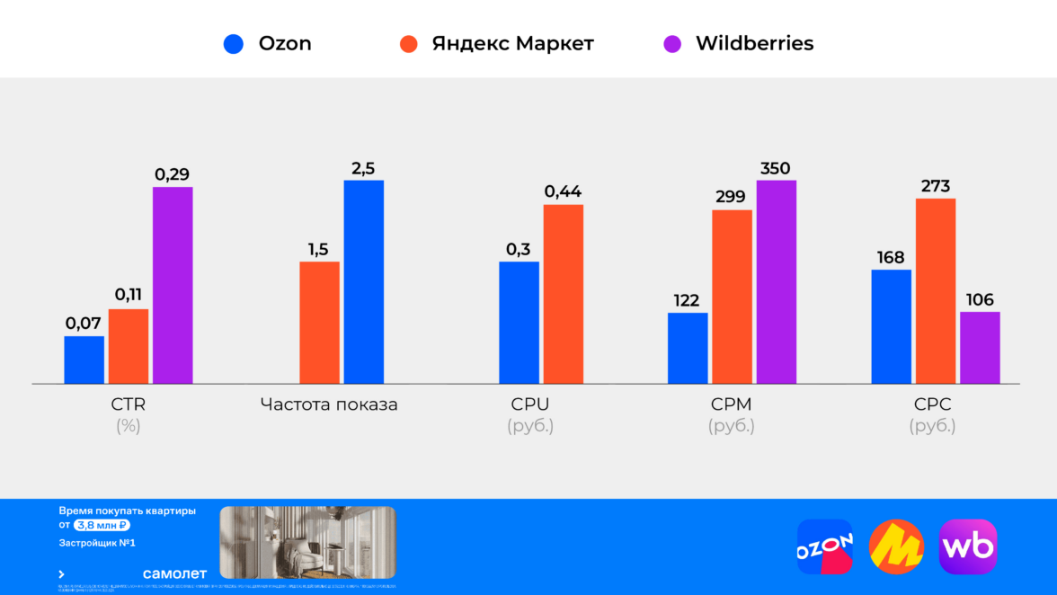 Закупочные условия. Низкие пороги по бюджетам у Ozon и «Яндекс Маркета», у Wildberries минимальный бюджет — 500 тыс. руб. для формата с 2−11-м местом в слайдере на главной, 3 млн руб. — для первого места. CPM также значительно отличаются.