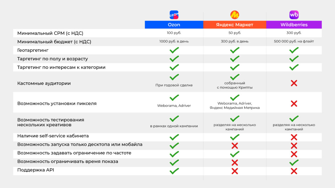 Каждый из маркетплейсов будет полезен на этапе построения знания о бренде, однако мы рекомендуем выбирать тот или иной маркетплейс в зависимости от задачи рекламной кампании — охват или трафик, а также учитывать минимальные бюджеты, необходимые для старта.