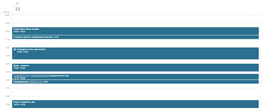 До недавнего времени операционка съедала буквально все свободные минуты. Помогла наш аккаунт-директор Ульяна: на примере своего календаря она показала, как я могу оптимизировать загрузку. Часть встреч можно перенести, а какие-то вопросы вообще решить текстом. Плюс я выработала для себя ряд правил: — утром проверять и валидировать все встречи, — оставлять только самые важные, — никогда не ставить встречи на час — максимум 30–40 минут, оставшегося времени хватит на решение операционных задач. И еще: отменять встречи день в день нормально — если зашиваешься. Люди с пониманием относятся к форс-мажорам и готовы идти навстречу.