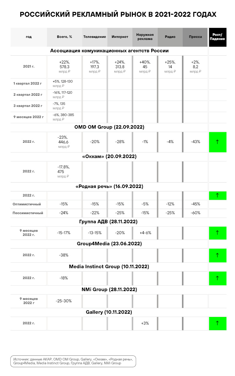 По оценке Михаила Елисейкина, директора по трейдингу и медиапартнерствам холдинга Group4Media, речь идет о «двузначном сокращении рынка в процентах», а в абсолютном выражении объем инвестиций в рекламу по итогам девяти месяцев не превысил 300 млрд рублей. Таким образом, если исходить из того, что в январе-сентябре 2021 года эксперты АКАР оценили рекламный рынок в 395 млрд рублей, то падение составило около 24%, подсчитал ADPASS. Елисейкин утверждает, что снижение наблюдается по всем медиа и только наружная реклама и радио по итогам 2022 года покажут рост к прошлому года.