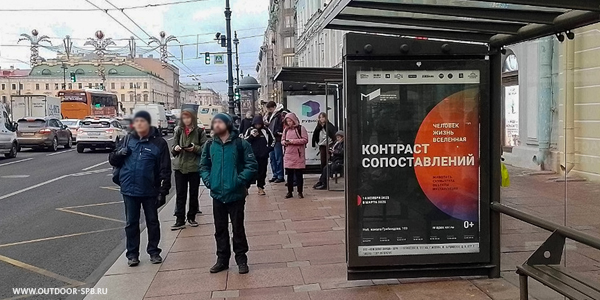 Афиша с анонсом нового проекта «ЧЕЛОВЕК — ЖИЗНЬ — ВСЕЛЕННАЯ. КОНТРАСТ СОПОСТАВЛЕНИЙ» размещена на остановках общественного транспорта в центре города на Невском проспекте и Дворцовой площади. Размещение стартовало в декабре и рассчитано на 3 месяца.