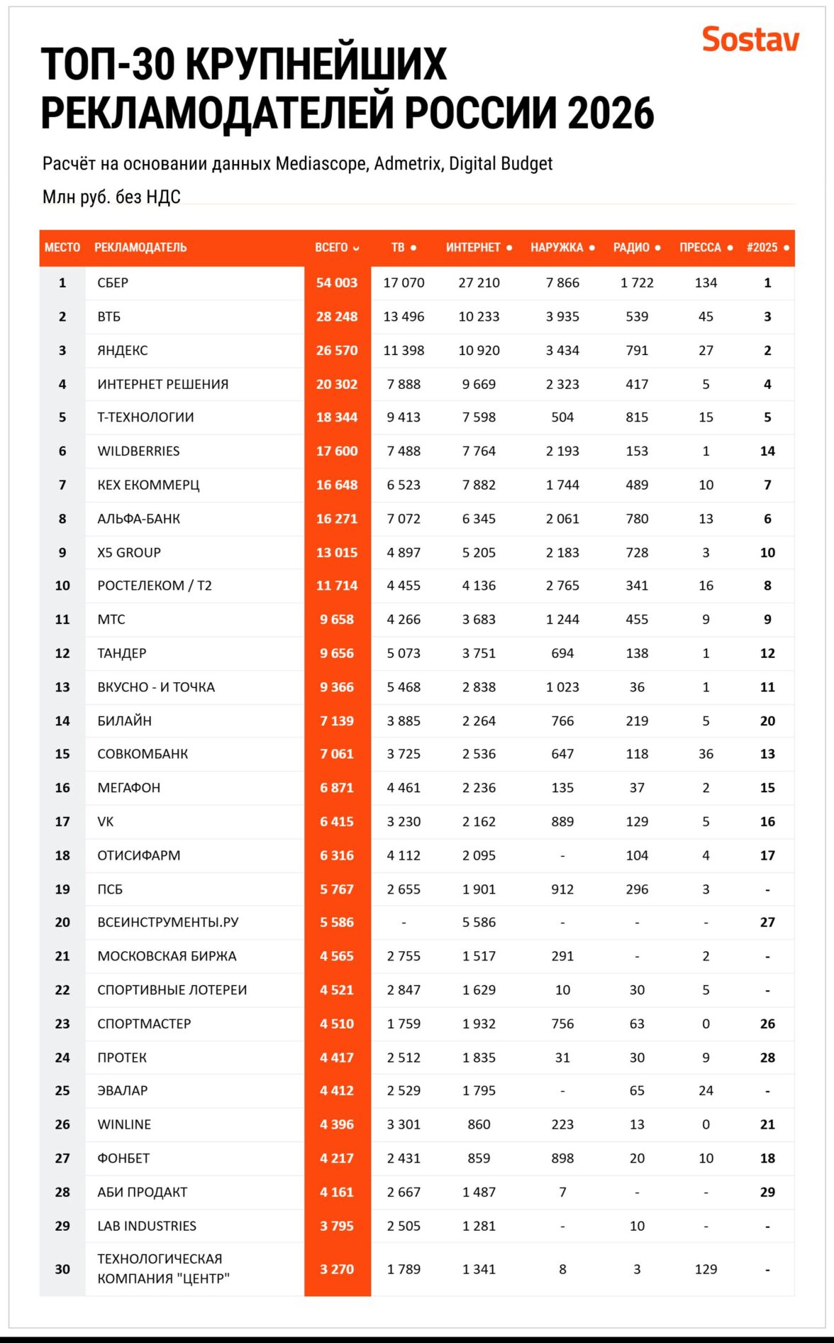 Sostav оценил рекламные бюджеты 30 крупнейших российских рекламодателей в 2025 году. По расчетам издания, расходы лидеров выросли на 19,5% по сравнению с 2024 годом, до 338,8 млрд рублей (без НДС). У топ-10 игроков динамика была еще выше — 21,4%. Они увеличили объемы закупок рекламы до 222,7 млрд рублей.