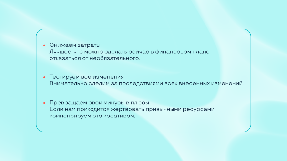 2. Тестируем все изменения. Внимательно следим за последствиями всех внесенных изменений. Если мы тратим бюджет на рекламу у блогеров для продвижения через социальные сети, но не видим результата — отказываемся от этого инструмента, заменяем его другим. Если переход на удаленку сказался на качестве работы сотрудников, договариваемся работать в коворкинге. Словом, теряя в количестве, внимательно следим за качеством.