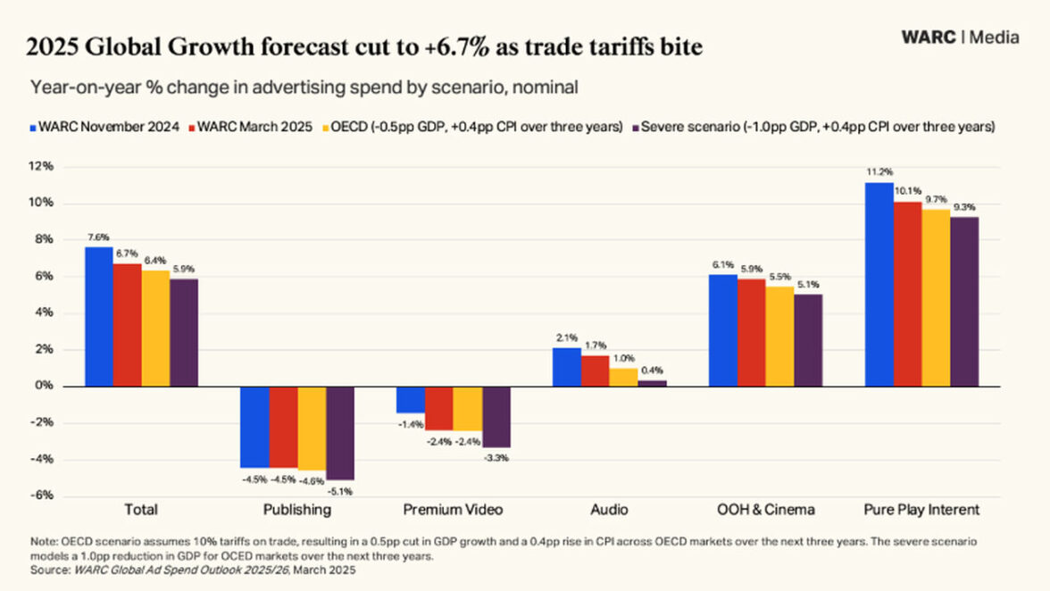 В самом пессимистичном сценарии, предполагающем еще более жесткие действия США против своих торговых партнеров, WARC прогнозирует темп роста мирового рекламного рынка на уровне 5,9% (на 0,8 п.п. ниже, чем в базовом сценарии), а недополученные отраслью доходы составят $9,5 млрд.