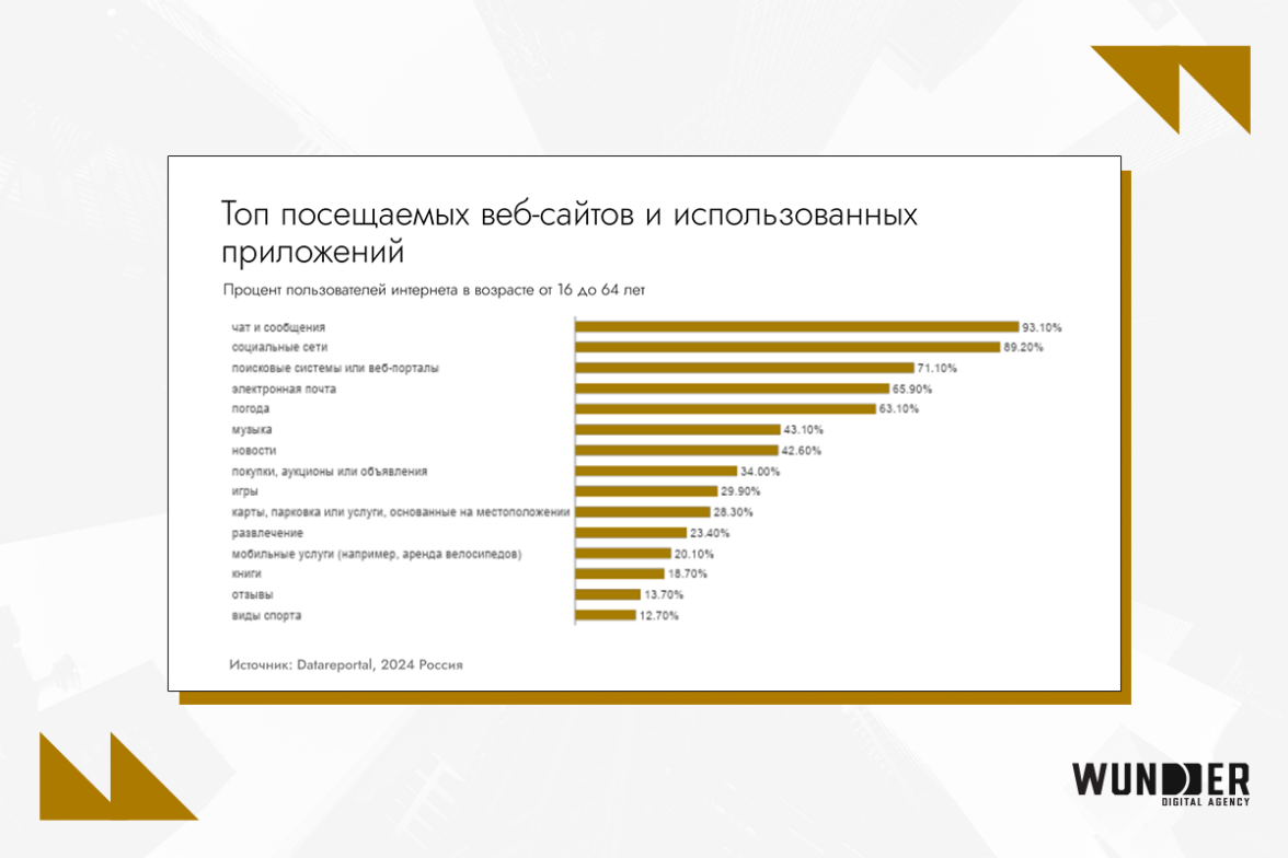 По данным Федеральной службы государственной статистики, Datareportal и Mediascope, общая интернет-аудитория Российской Федерации составляет 130,4 млн чел. Проникновение интернета в стране — 90,4%. При этом 92% потребления приходится на мобильный интернет. Социальными сетями пользуется 106 млн пользователей или 73,5% от общей численности населения.