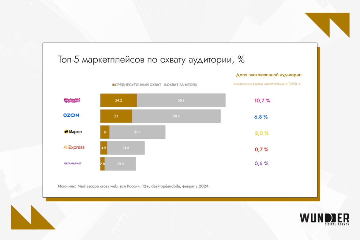 В это же время маркетплейсы больше не являются просто площадкой для продаж. Их охват уже сопоставим с крупными порталами и социальными сетями.