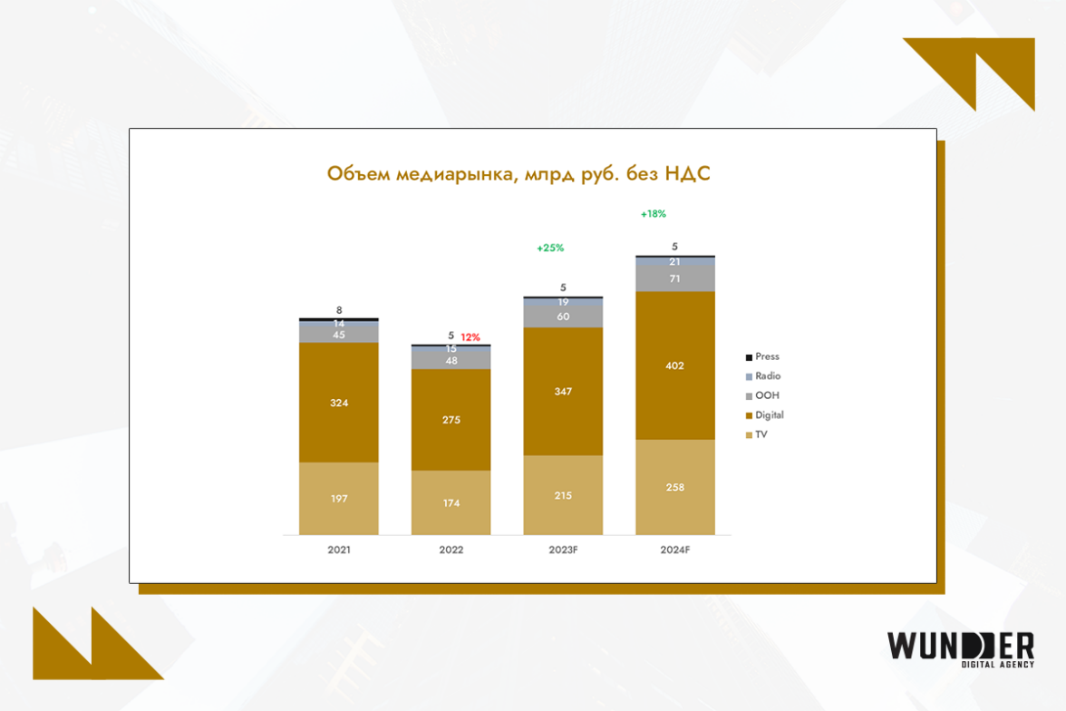 Рекламный рынок бьет исторические максимумы по объемам затрат. При росте рекламного рынка в мире на уровне +5,3–5,8% российский рынок растет темпами в +45% на конец 2023 года. По прогнозам, он вырастет еще на 32% к концу 2024-го.