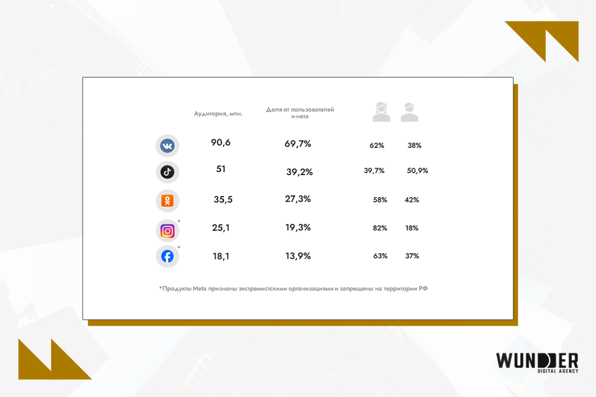 По данным DataReportal, по доле пользователей среди социальных сетей лидирует VK — 69,7%, на втором месте TikTok — 39,2%.