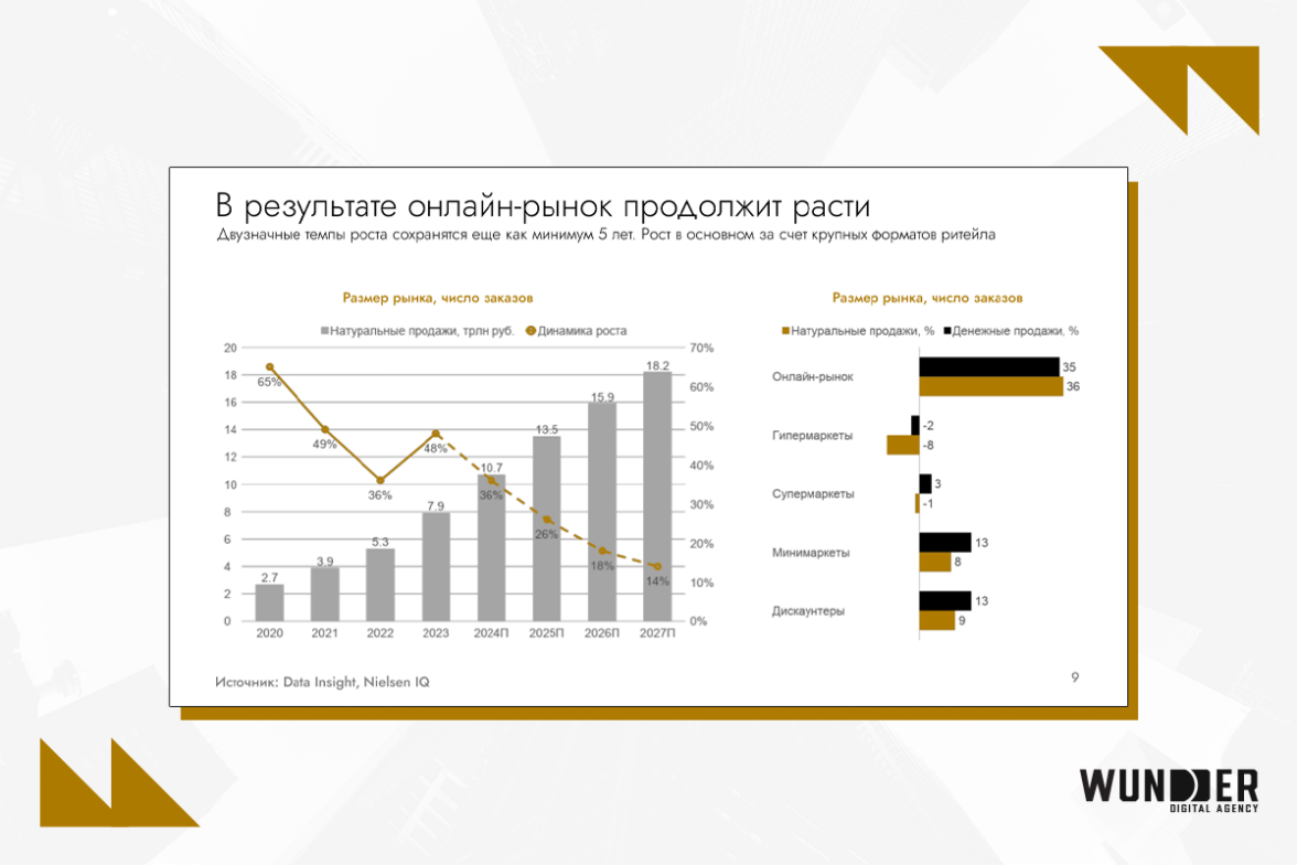 Можно заметить, что инфляция имеет отличия по категориям. Наибольший рост цен — на продовольственные товары. Благодаря этому в том числе усилилась роль онлайна. Там, по мнению потребителей, можно найти товары по более низкой цене. По прогнозам, двузначные темпы роста, до насыщения рынка, сохранятся еще минимум на 5 лет. Масштабирование будет происходить за счет крупных форматов ритейла.