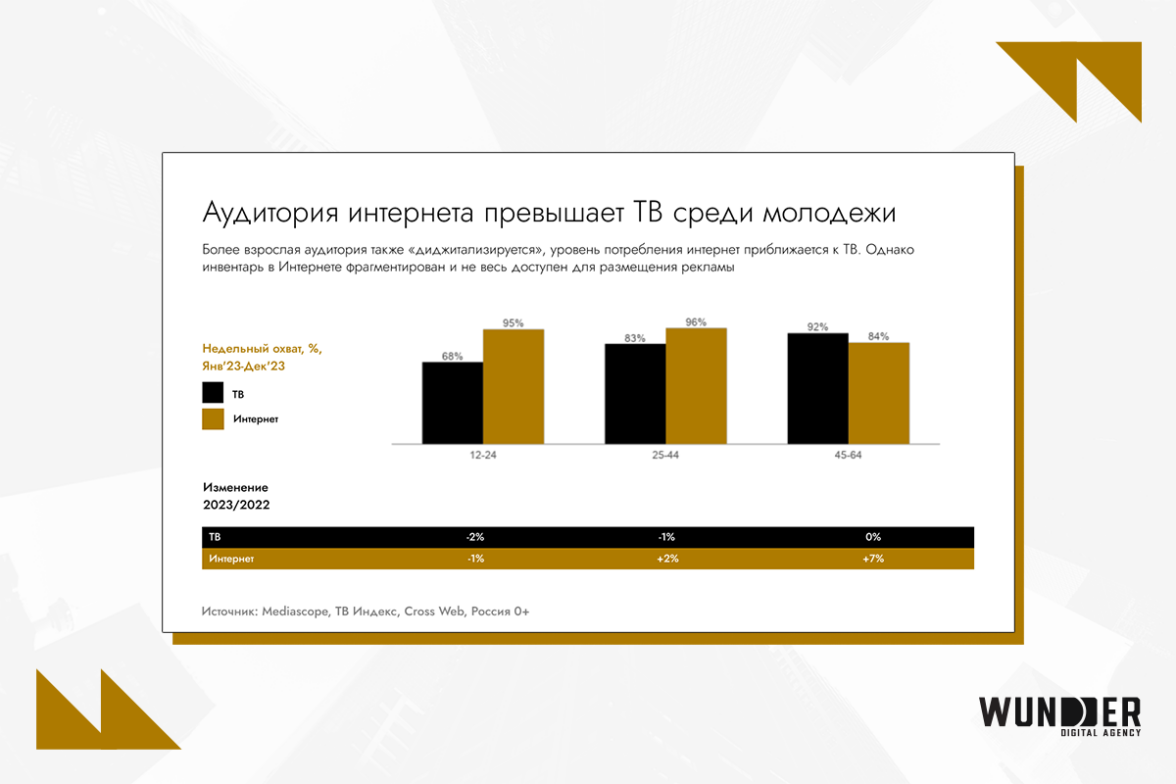 Численность интернет-аудитории среди молодежи значительно превышает ТВ-аудиторию, что не удивительно. Однако более взрослая аудитория также «диджитализируется»: уровень потребления контента в интернете приближается к потреблению контента на ТВ.