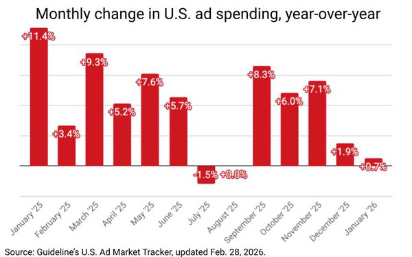 Крупнейший в мире рекламный рынок, американский, показал рост на 0,7% в январе 2026 года относительно первого месяца 2025-го. Это второй месяц слабого роста подряд, в декабре рост составил лишь 1,9%, рассчитали аналитики Guideline на основе своего рекламного трекера. Ожидается, что мировой рекламный рынок в 2026 году увеличится на 9,1% до $1,3 трлн, это в 3,5 раза выше прогноза роста мировой экономики. Драйверами мировой рекламы будут более стабильные рынки — Китай, Великобритания и Бразилия.