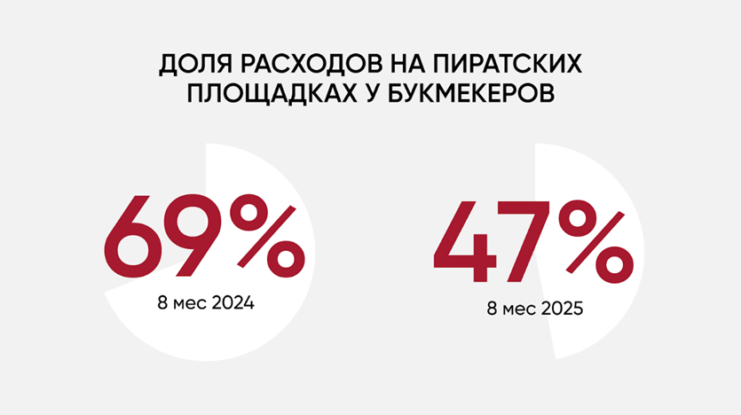 Доля пиратских видеосервисов в рекламных затратах букмекерских контор в январе-августе оказалась на 22 процентных пункта ниже, чем годом раньше, — всего 47%, рассказала ADPASS руководитель аналитического направления Digital Budget Юлия Алиферова.