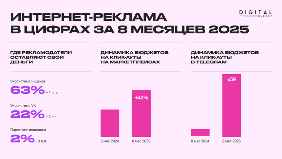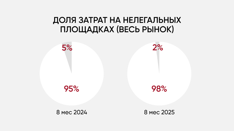 Проведя мониторинг рынка интернет-рекламы, аналитический центр Digital Budget обнаружил, что в январе-августе 2025 года объем бюджетов, направляемых на размещение у пиратов, сократился более, чем вдвое — на 56%. При этом доля рекламных затрат, выделяемая на размещение у пиратов, в структуре всех затрат рекламодателей сократилась — с 5% до 2% по сравнению с аналогичным периодом прошлого года.