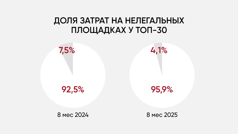 Особенно резко снизили расходы на продвижение у пиратов представители категории продуктов питания — до 0,2% против 12,3% за аналогичный период 2024 года. Среди тех, кто активно нес деньги нелегалам, были производители мебели и предметов интерьера (1,8%), а также онлайн-игры (1,5%). В остальных категориях рекламодатели потратили на размещение у пиратов менее 1%.