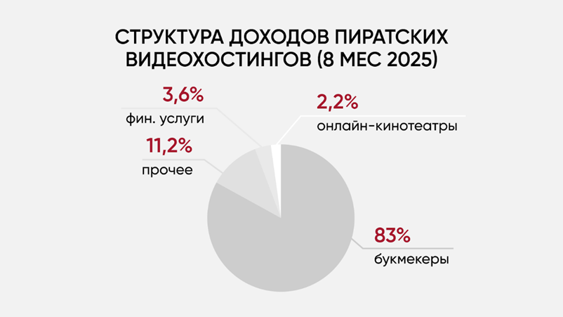При этом букмекеры остаются для пиратов самым крупным рекламодателем: по данным исследователей, они с большим отрывом занимают первое место среди тех, кто покупает размещение в нелегальном контенте. На втором и третьем местах — финансовые услуги (3,6%) и онлайн-кинотеатры (2,2%).