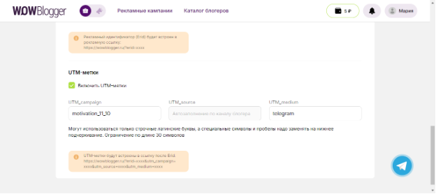 Опция доступна для кампаний в Telegram. Чтобы UTM-метки автоматически встроились в ссылку рекламного поста после Erid, необходимо выбрать «Включить UTM-метки».