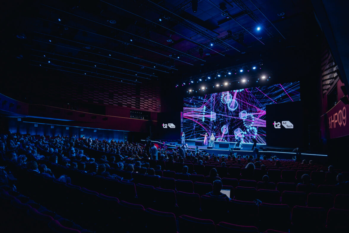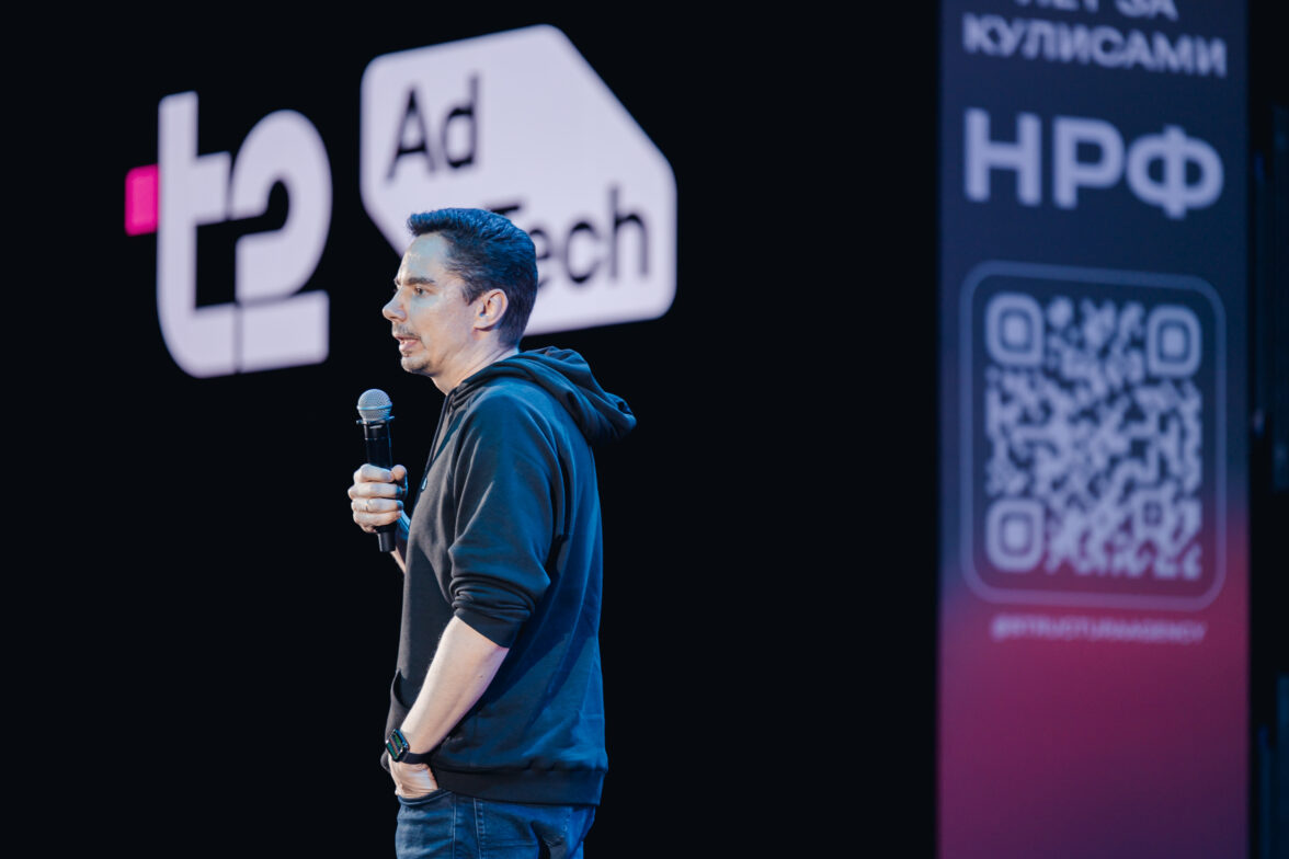 Тогда весь шум пропадает на мгновение, артисты словно испаряются, зажигается свет, и на сцене под звуки оваций появляется сам Антон Мерзляков. Такое яркое предисловие к его выступлению не оставляет никого равнодушным, а метафора, заключенная в перформансе артистов, отзывается проблемой у многих представителей индустрии: как не просто говорить сквозь шум, но и доносить смыслы? То самое решение — Т2 AdTech — впервые презентуется здесь и сейчас.