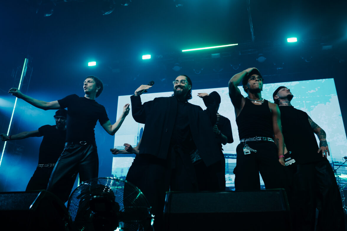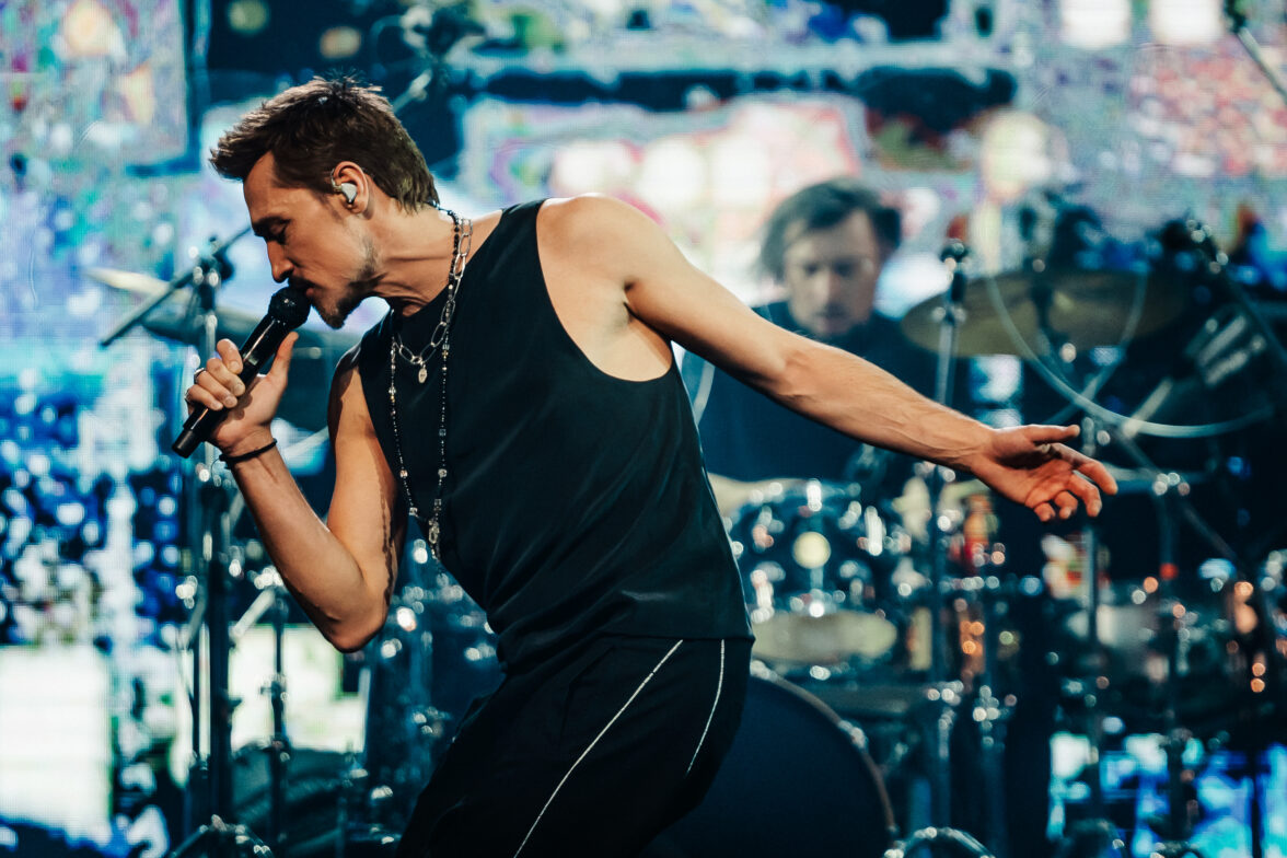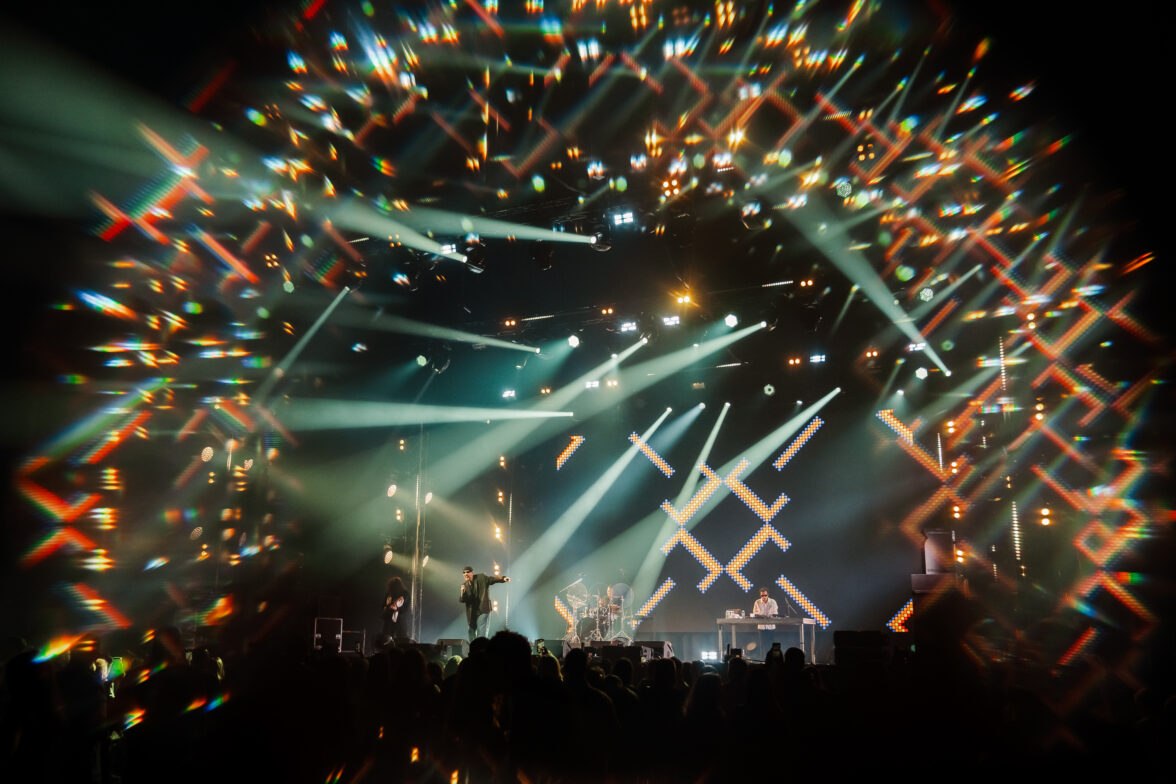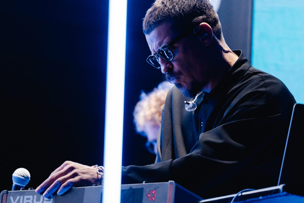 Свет гаснет, и начинается перфоманс от Яндекс Плюс AdTech. В светящемся кубе появляется Антон Беляев, основатель проекта LAB и Therr Maitz. Вместе с компаньоном-гитаристом они начинают музыкальное представление.