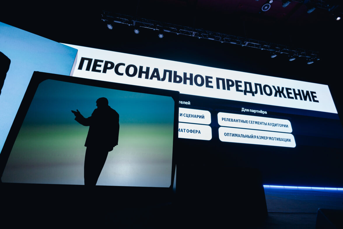 На сцену выходит Андрей Гевак, CEO Яндекс Плюс AdTech. Он представляет это экосистемное решение — Яндекс Плюс Adtech:
