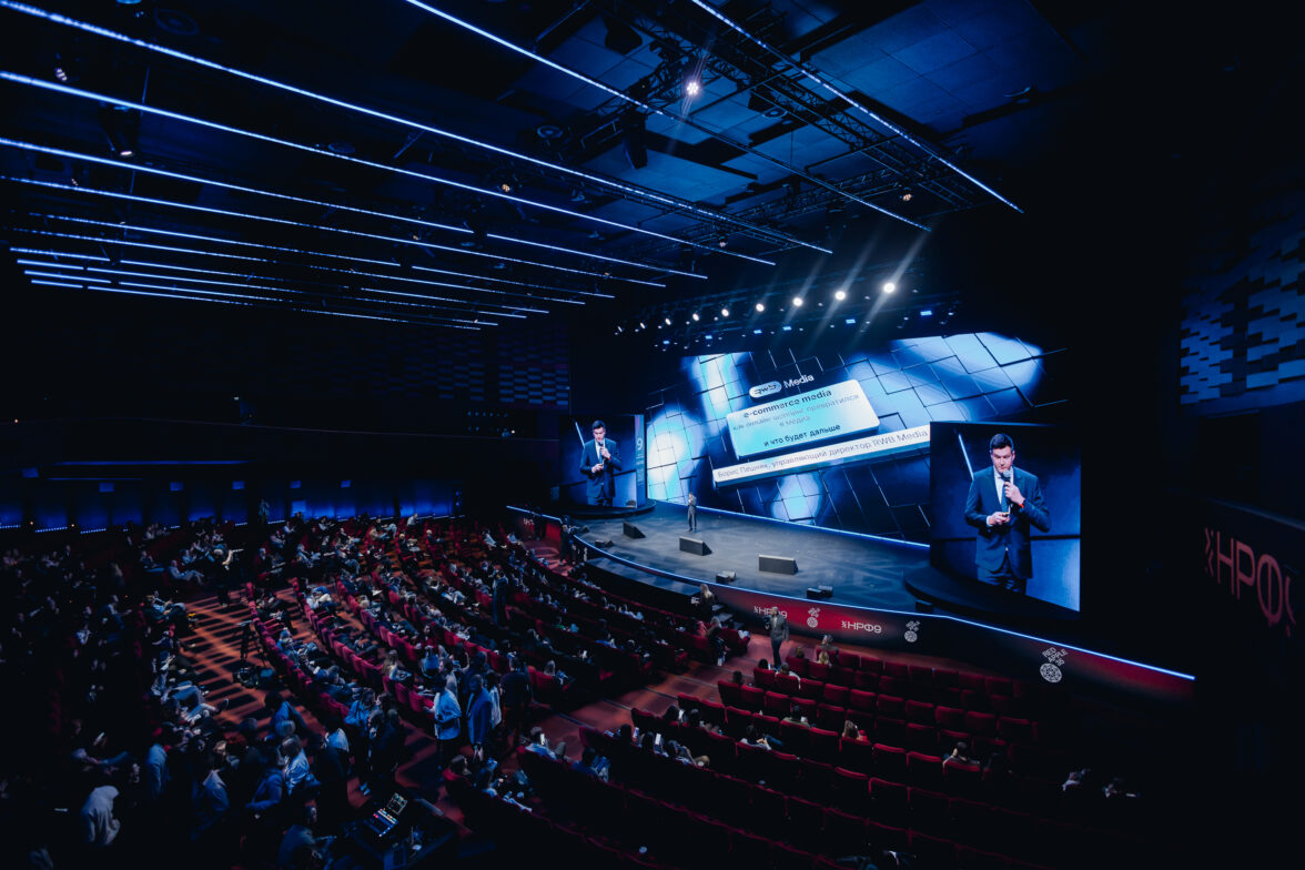 Следующее на очереди — выступление «E-commerce media: как онлайн-шоппинг превратился в медиа, и что будет дальше» от RWB Media. На сцену выходит Борис Пешняк, управляющий директор RWB Media. Он рассказывает о том, как на рынке рождается новая экосистема — униритейл, где покупка становится коммуникацией.