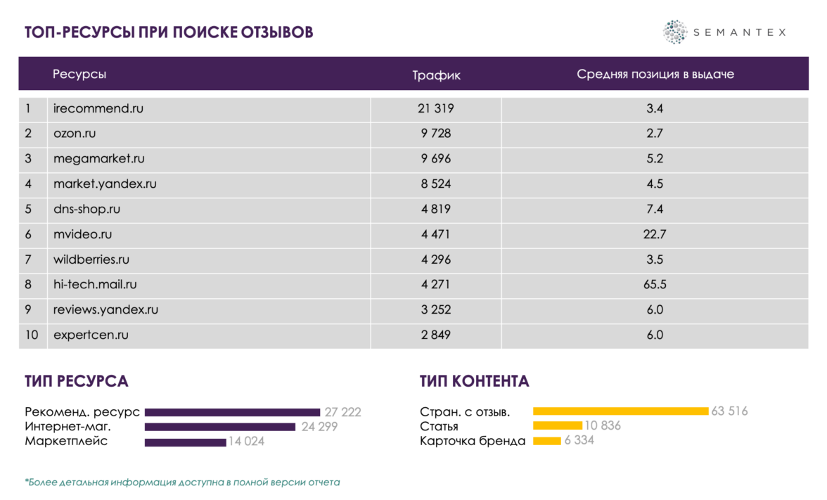 Часто встречающийся тип ресурсов — рекомендательный ресурс, интернет-магазин, маркетплейс. Тип контента — страница с отзывами, статья, карточка бренда.