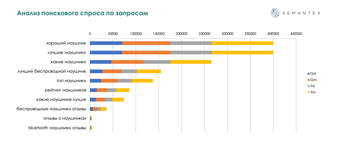 Для определения предпочтений пользователей в исследуемом сегменте был проведен анализ контента поисковой выдачи Яндекс и Google (мобильная и Desktop-версии, ТОП-10). Часто встречающиеся ключевые запросы следующие: «хороший наушник», «лучшие наушники», «какие наушники», «лучший беспроводной наушник», «топ наушники», «рейтинг наушников», «какие наушнике лучше», «беспроводные наушники отзывы», «отзывы о наушниках», «bluetooth наушники отзывы».