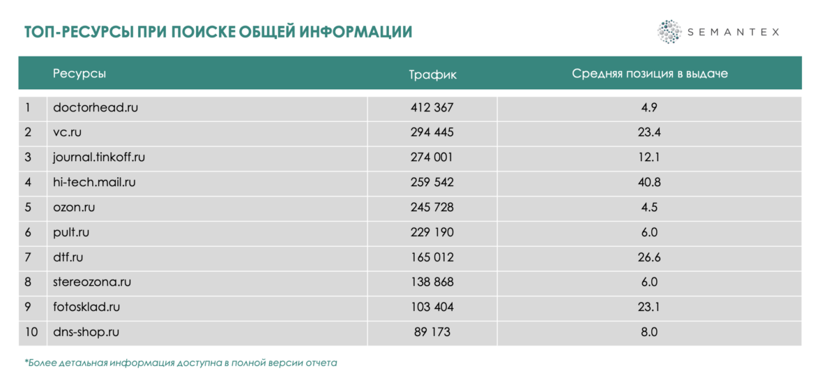 irecommend.ru (трафик: 21 319, средняя позиция в выдаче: 3.4),