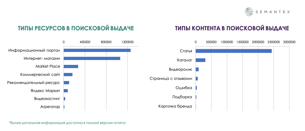 Отметим, что в выдаче пользователи в основном видят информационные порталы, интернет-магазины и маркетплейсы. Самый популярный (с т.з. приходящего трафика) тип контента — статья, каталог, видеоролик.