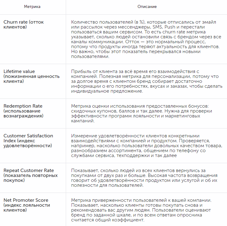 Маркетинг — это система, которую не стоит оценивать только по одному показателю. Чтобы проверить, работает ли стратегия, когда вы запускаете кампании на удержание и повышение лояльности клиентов, используются также другие метрики.