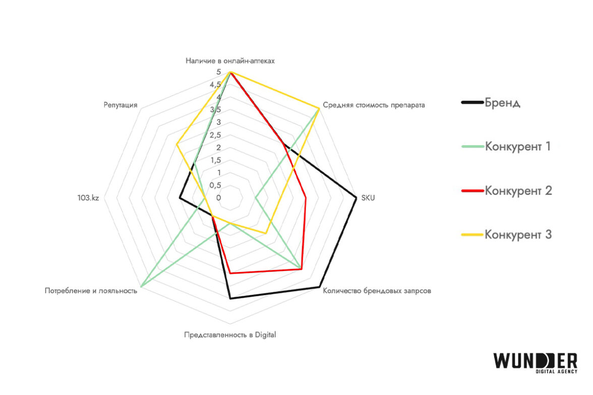 Проведя анализ, строим конкурентную матрицу. Я предпочитаю использовать «Многоугольник конкурентоспособности», где выбираю ключевые факторы для сравнения, а затем анализирую данные.