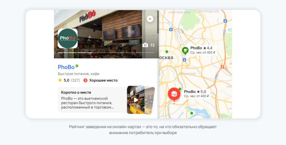 За последние полгода мы подняли средний рейтинг по PhoBo на Яндекс Картах с 4,06 до 4,73, а по «ВьетКафе» — с 4,38 до 4,5.