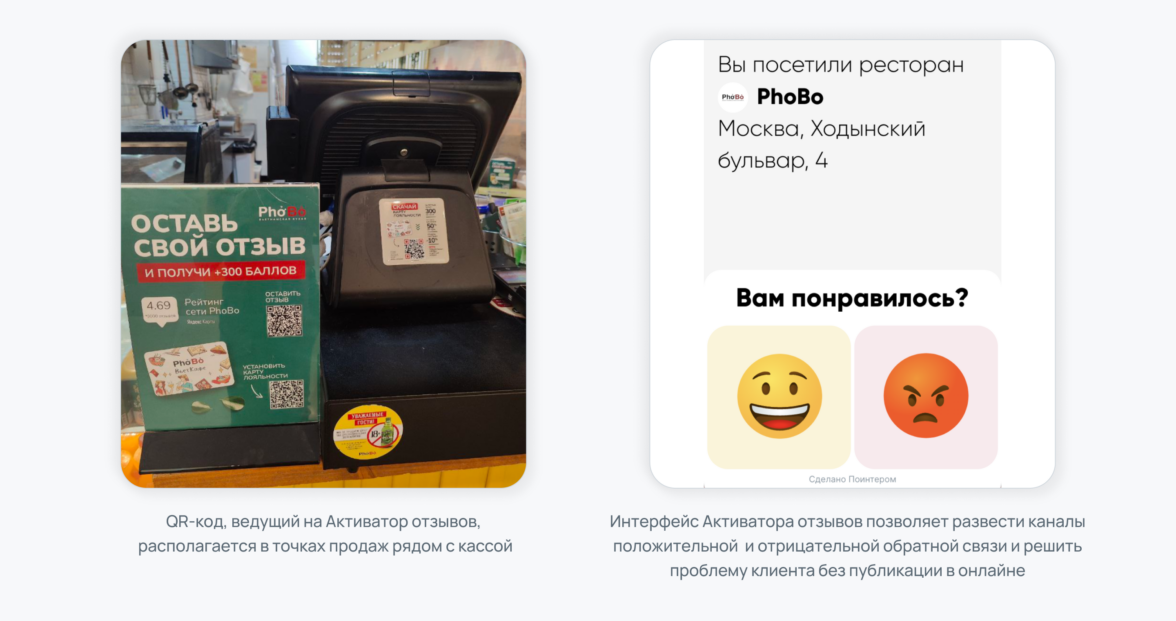 В каждой точке рядом с кассой располагается тейбл-тент с QR-кодом, который ведет на страницу Активатора. При переходе в Активатор клиенту предлагается выбрать, позитивный или негативный отзыв он хочет оставить. Положительный отзыв моментально публикуется на Яндекс Картах (именно на этой платформе мы сфокусировали внимание). А отрицательный отправляется напрямую в компанию для разбирательства и отработки.