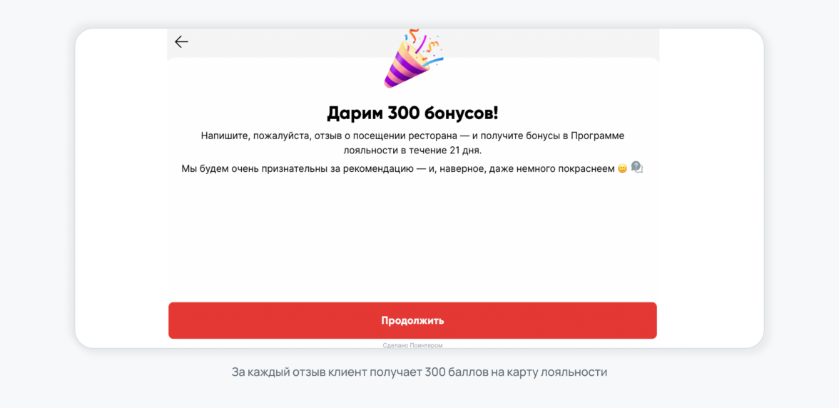 Летом 2023 года перед маркетингом была поставлена задача повысить рейтинг наших кафе и ресторанов. Инструментом для достижения цели был выбран Активатор отзывов Поинтера. Мы подключили его к общей программе лояльности: за любой отзыв клиент получает 300 бонусов, которые может потратить при заказе в ресторане.