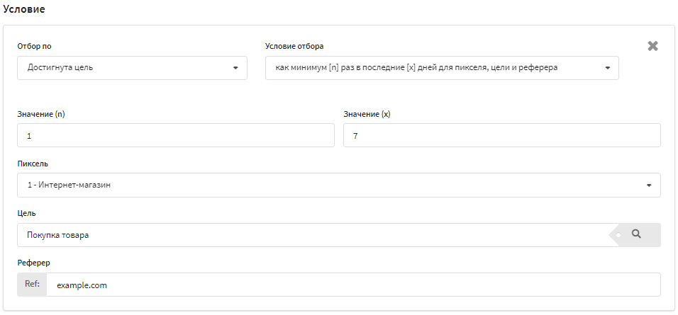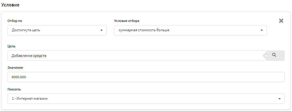 Сумма покупок для анализа отслеживается на внешних ресурсах: сайтах, соцсетях, приложениях, CRM. Пиксели Altcraft Platform регистрируют выполнение целей (например, совершение покупки на определённый чек), которые настраиваются в самой платформе. Здесь задаётся также критерий «Monetary» для шкалы RFM-анализа: сумма меньше/больше/равна значению N.