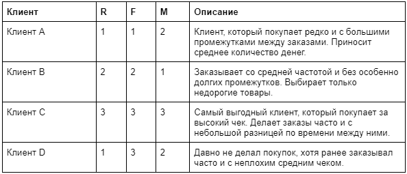 В итоге у каждого клиента появляется трёхзначная оценка. Например, клиент с RFM 221 покупал не так давно, также он время от времени возвращается к покупкам, но тратит очень мало.