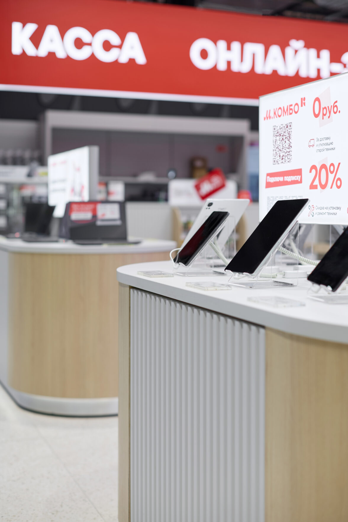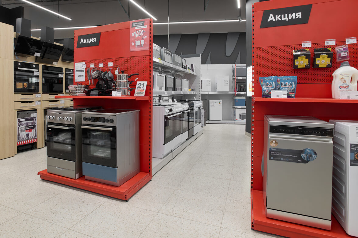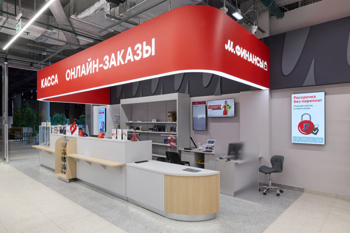 Также оформлена зона ЦОК (центр обслуживания клиентов), где представлены сервисы «М.Финанс» и «М.Мастер», которые обеспечивают клиентам помощь в установке и обслуживании техники. В единой зоне покупатель может оформить все товары и услуги — покупку, кредит, доставку, установку. Это делает компанию не только продавцом, но и надёжным партнёром в вопросах бытовой техники.
