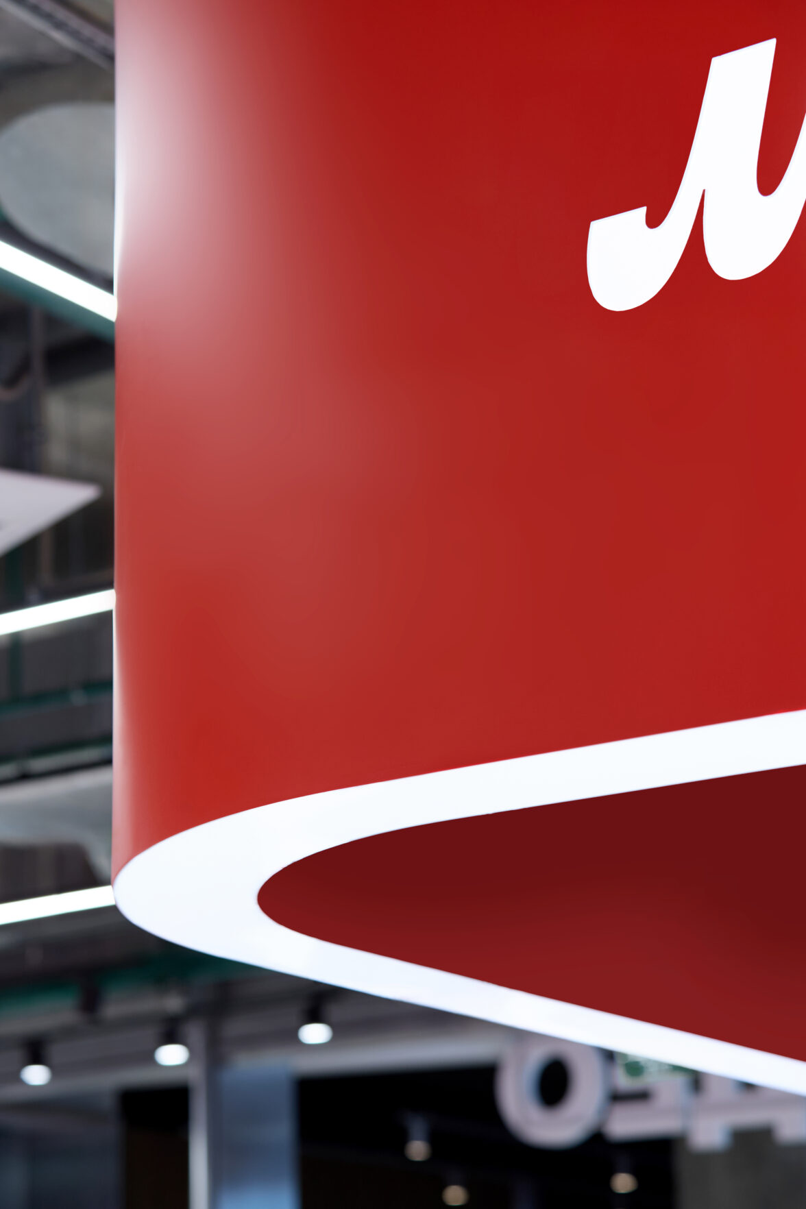 Фирменный стиль «М.Видео», разработанный ранее агентством LINII, получил своё развитие в ритейл-пространстве: акцентный красный цвет бренда, паттерн из плавных фрагментов логотипа, форма торговых стеллажей — всё это гармонично стилизовано в интерьере магазина.