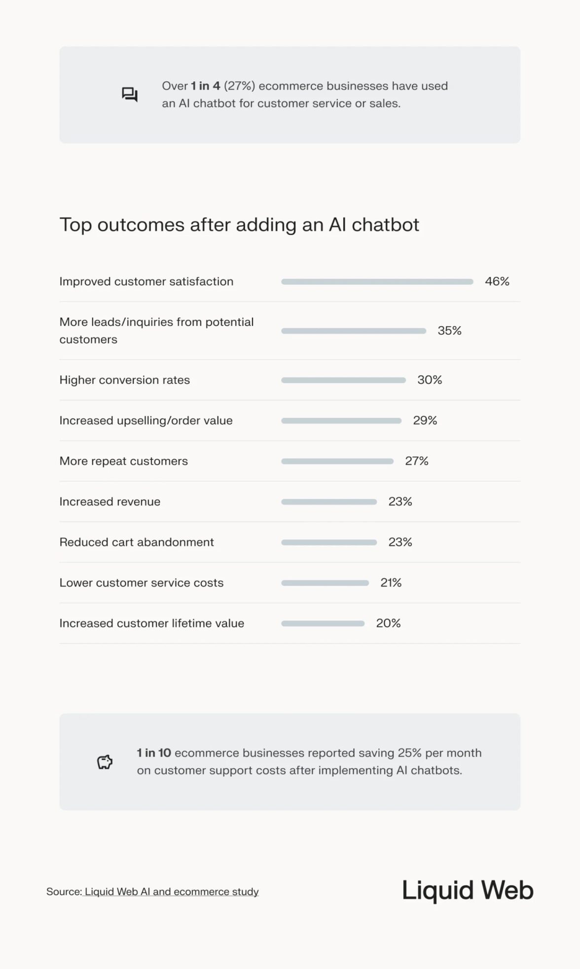 Другое применение ИИ в ритейле — чат-боты с искусственным интеллектом. 27% респондентов Liquid Web используют их для продаж и поддержки пользователей.