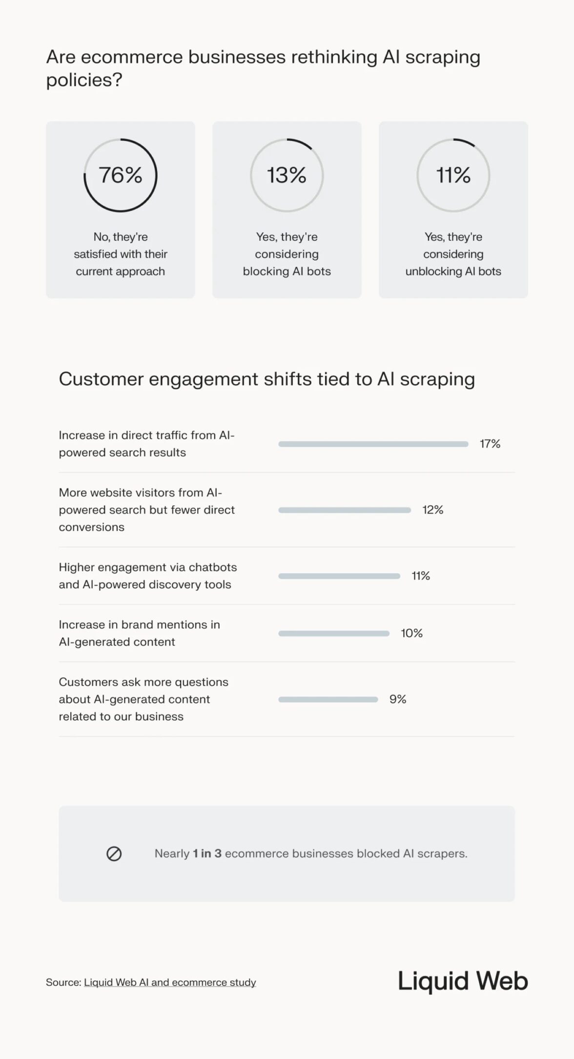Помимо обработки заявок в службу поддержки чат-боты подбирают размеры одежды, рекомендуют сопутствующие товары, сообщают об акциях и помогают пользователям сделать выбор в режиме реального времени. ИИ также собирают данные о клиентах. Но в этой области пока есть недочеты, заявляют в Liquid Web — каждый третий онлайн-магазин заблокировал ИИ-ботам доступ к содержимому своего сайта, сославшись на проблемы со сбором данных и обучением моделей.