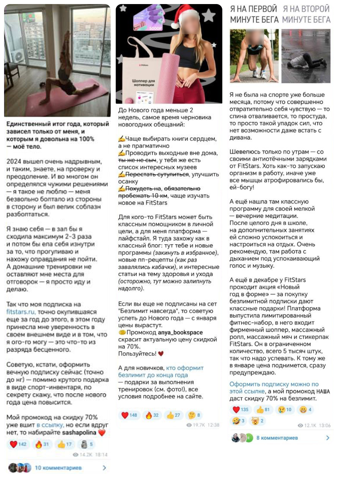 Может показаться неочевидным, но FitStars лучше всего продают не фитнес-блогеры и спортсмены, а обычные женщины. Они хотят сбросить вес, повысить выносливость, справиться с подледствиями сидячей работы — всё то же, что и их аудитория. Поэтому реклама домашних тренировок встраивается органично в их контент о лайфстайле, бьюти, книгах, медицине, дизайне и многом другом.
