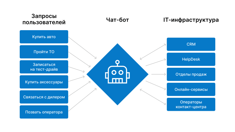 Мы проанализировали восемь продуктов для сборки чат-ботов и выбрали Sherlock Platform. На ее базе разработчики создали масштабную инфраструктуру: запустили бота сразу в шести каналах (на сайте, в Telegram, «Одноклассниках», WhatsApp, VK и Viber), объединили все заявки в одной CRM и интегрировали ее с бизнес-процессами бренда — записью на тест-драйв, обращением к дилеру или кредитному специалисту.