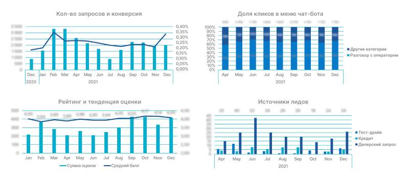 Для того чтобы следить за выполнением бизнес-задач и востребованностью бота в целом, мы разработали дашборд с отчетами по 14 критериям — от оценки операторов до распределения кликов по меню.