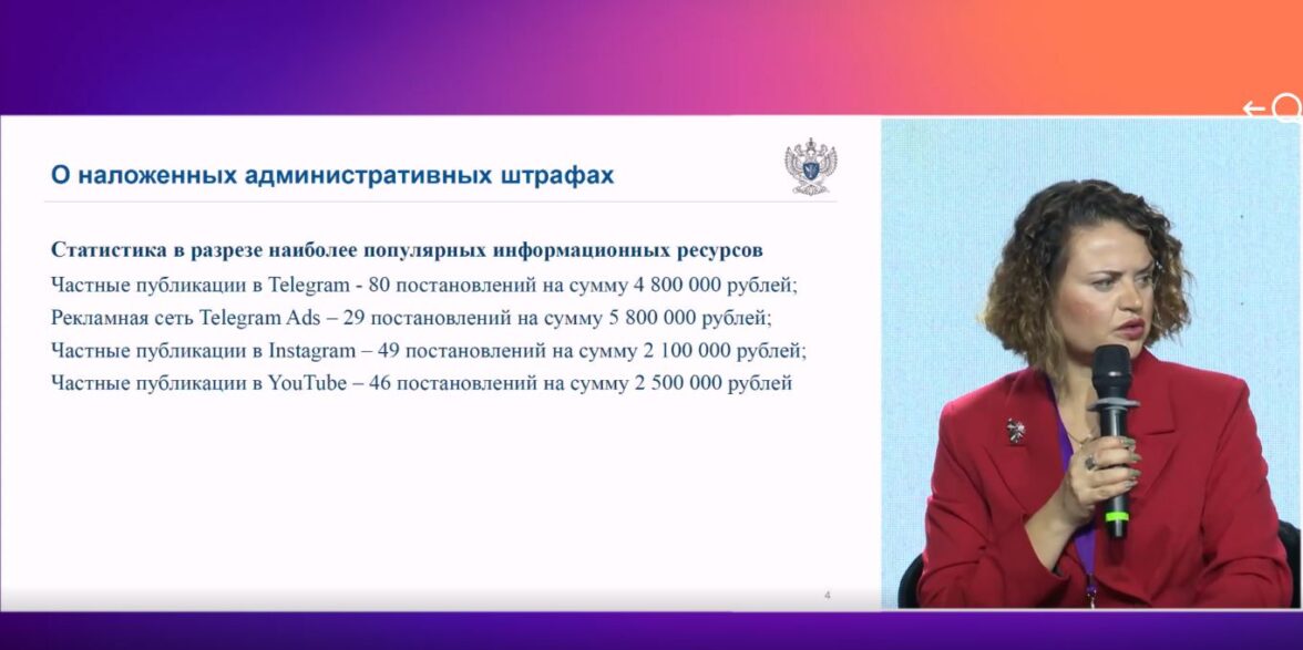 Она также поделилась статистикой по штрафам в разрезе популярных социальных платформ. Так, в отношении рекламных объявлений Telegram Ads было вынесено 29 постановлений о привлечении к административной ответственности на сумму 5,8 млн рублей. Роскомнадзор вынес 80 постановлений на сумму 4,8 млн рублей за нарушения законодательства в частных постах в Telegram, по размещениям в YouTube вынесено 49 постановлений на 2,5 млн рублей, по запрещенной в России и принадлежащей экстремистской организации соцсети Instagram — 46 постановлений на 2,1 млн рублей.