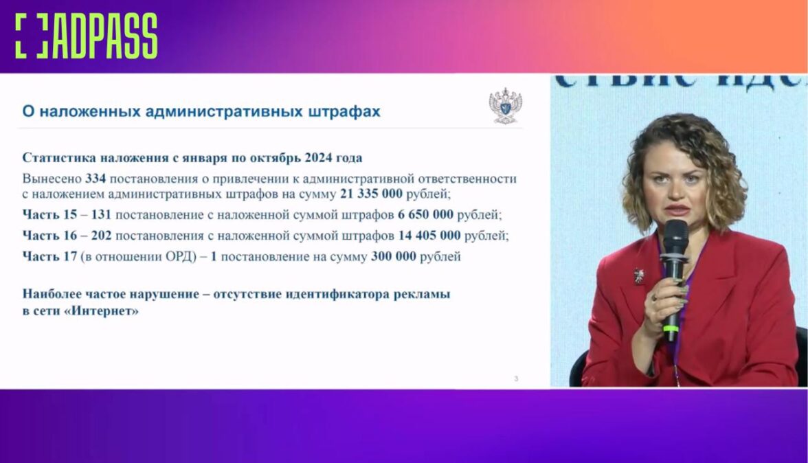 Роскомнадзор впервые обнародовал статистику по штрафам за несоблюдение требований закона о маркировке интернет-рекламы. В январе-октябре 2024 года служба вынесла 334 постановления о привлечении к административной ответственности с наложением штрафов на общую сумму 21,335 млн рублей, рассказала начальник управления правового обеспечения, международного и общего взаимодействия Роскомнадзора Мария Смелянская на конференции «Рекламное право`2024», которую провела платформа для юристов We Talk Pro.