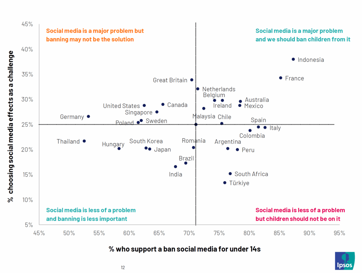 На диаграмме — две оси: горизонтальная показывает долю людей, которые поддерживают запрет соцсетей для детей до 14 лет, вертикальная — долю тех, кто считает, что влияние соцсетей является серьёзной проблемой. Правый верхний квадрат, показывает процент респондентов, которые считают считают, что «Соцсети — серьезная проблема, и детей нужно от них оградить» (Франция, Индонезия, Испания, Италия, Австралия, Мексика, Ирландия, Бельгия, Нидерланды), Левый верхний квадрат — «Соцсети — серьезная проблема, но запреты не лучший выход» (США, Великобритания, Германия, Швеция, Сингапур, Польша), Правый нижний квадрат — «Соцсети не воспринимаются как угроза, но детей лучше туда не пускать» (Испания, Италия, Колумбия, Перу, Южная Африка, Турция), Левый нижний квадрат — «Соцсети не считаются серьезной проблемой, и запреты не нужны» (Таиланд, Южная Корея, Япония, Индия, Бразилия, Венгрия).