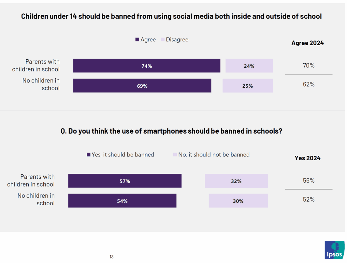 Инфографика из отчета Ipsos. За запрет соцсетей для детей младше 14 лет выступают 74% родителей и 69% респондентов без детей (против около четверти опрошенных). За запрет смартфонов в школах — 57% и 54% соответственно (оппоненты в среднем набирают порядка 30%).