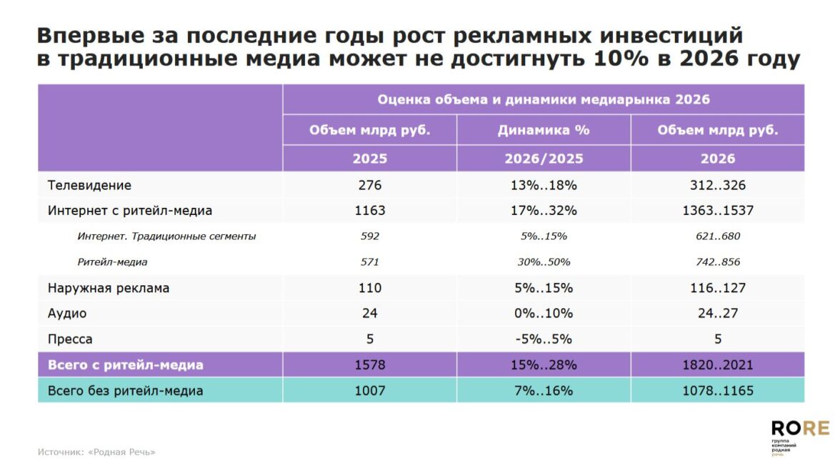 В 2026 году «Родная речь» ждет дальнейшего снижения динамики рынка — до 7-16% в традиционных сегментах и до 15-28% с учетом объема рекламы в ритейл-медиа.
