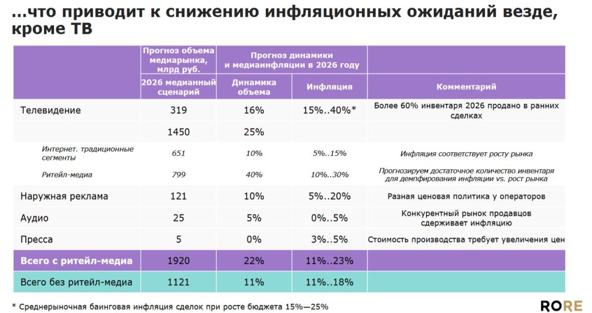 В целом по рынку, инфляция в традиционных медиа составит 11-18%, с учетом ритейл-медиа — 11-23%, ожидают в «Родной речи».