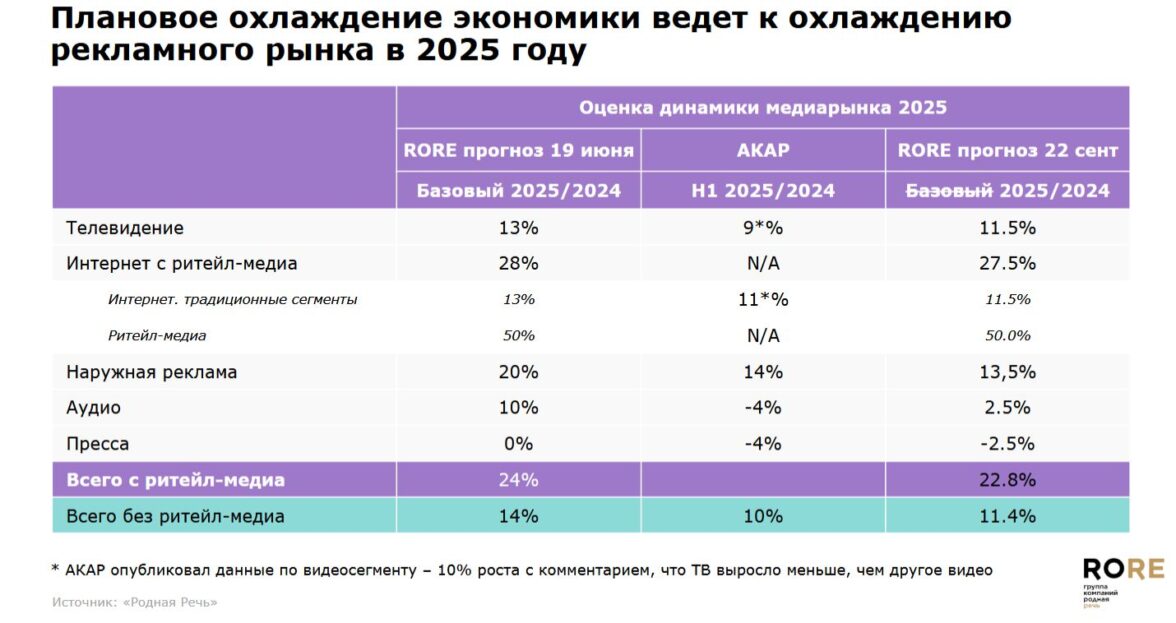 Рекламная группа «Родная речь» понизила свой прогноз развития российского рекламного рынка на 2025-2026 годы. Если в июне группа обещала рекламной индустрии рост в 2025 году на 14% без ритейл-медиа и на 24% с учетом этого сегмента, то теперь — на 11,4% и на 22,8% соответственно.