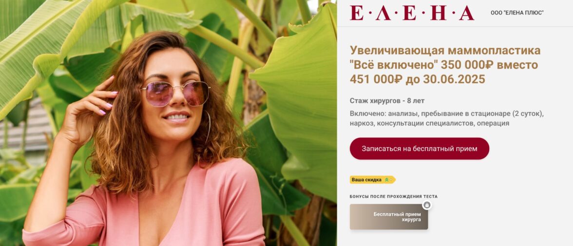 Клиника «Елена» — лидер пластической хирургии за Уралом с 30-летней историей. Узнаваемый бренд в Новосибирске и СФО, позиционирующий качество и надежность. На момент запуска кампания уже использовала поиск, РСЯ и МКБ в Яндекс.Директе.